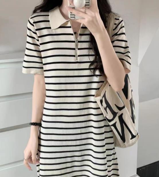 春夏新作 女 レディース ハイウエスト 半袖 ニット ボーダー柄 ミニ ワンピース ドレス 台型スカート